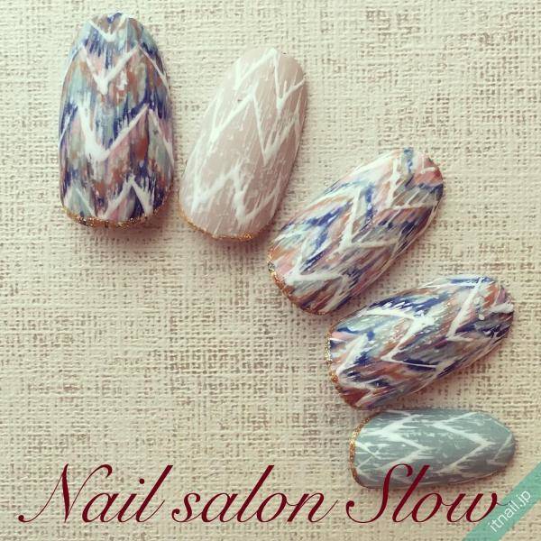 かすかな色の移り変わりや、パターン化されているようでされていないデザインの構図。とても複雑で味わいのある見た目のネイルが出来上がりますよ。
