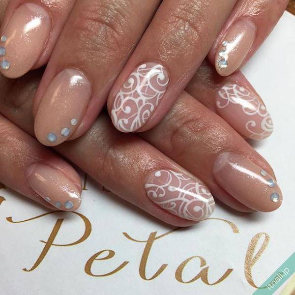 例えば、スキンカラーやクリアカラーをベースに、ホワイトでアラベスク柄を描いていく、というのはいかがでしょうか。込み入った柄のアラベスクも、スキンカラー×ホワイトという色構成でアートすれば、とても上品で女性らしい感じになります。