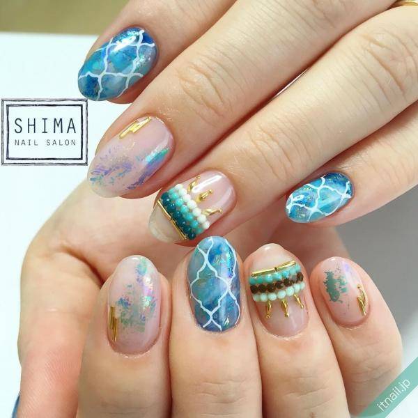 ブルーやグリーン、ライトブルーのマーブル柄をベースに、ゴールドでマラケシュ柄を描いていく…なんてデザイン、素敵ですよね!また、濃いめのブルーをベースにホワイトでマラケシュ柄を描き、どことなくひんやりとした質感を楽しめる陶器ネイル風に仕上げてみるのもおすすめです。