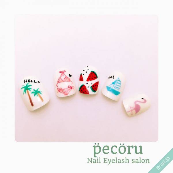 他の指にはリゾート気分を盛り上げてくれるようなパームツリーやスイカといったモチーフを取り入れてもいいですね。お気に入りを見つけてください。