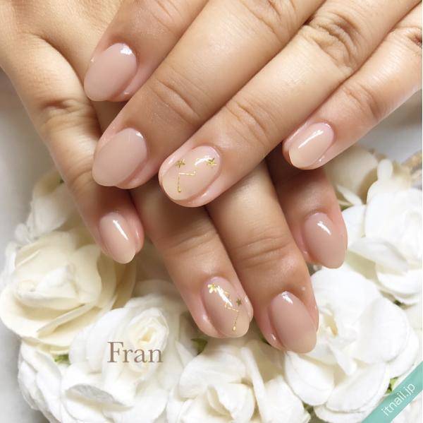 ヌーディーカラーのワンカラーネイルに、薬指にだけカシオペア座をゴールドで描いたネイル。