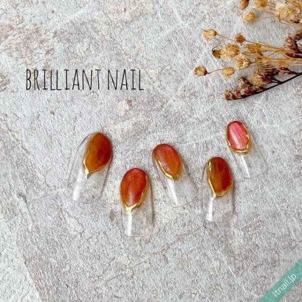 人気のミラーネイルも柿色とゴールドを合わせて大人の華やかさを演出してみてはいかがでしょうか。キラッと光る指先は何度も眺めたくなる美しさがありますね。