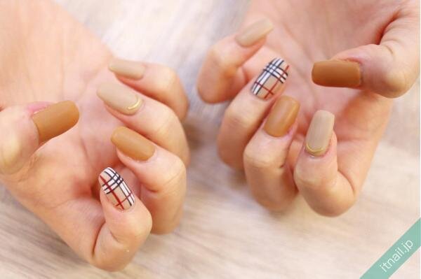 品のあるバーバリーチェックを取り入れた、大人女子にぴったりのネイルデザイン。秋冬ファッションとも相性がよさそうです。チェック柄がよく映えて、デザインに統一感が出るように、ほかの爪もベージュやキャメルなどまろやかなカラーでまとめましょう!