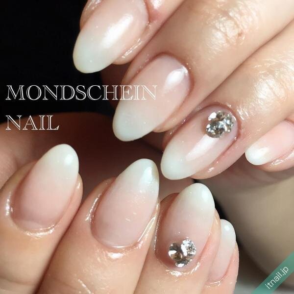 ピンクベージュのワンカラ―ベースの先端に、乳白色でグラデーションにした王道のベイビーブーマーネイル♡その根元に1本だけクリアストーンを置きましょう。控えめなサイズのストーンであれば、オフィスシーンでも浮きませんよ。
