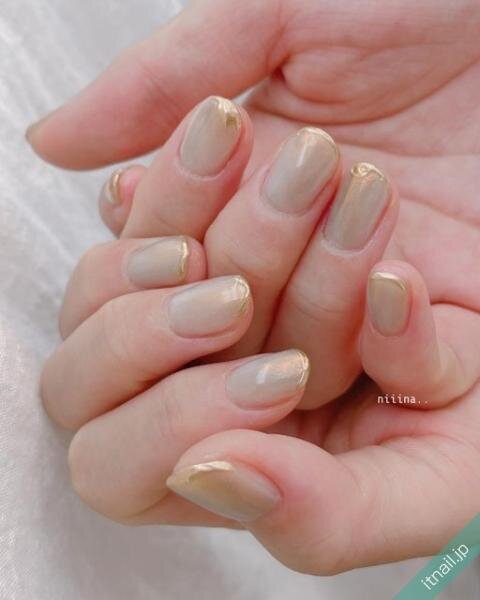 慣れてきたらオートミールカラーと別カラーのかけ合わせにもトライしてみましょう。画像は透け感のあるくすみベージュに、ゴールドのスキニーフレンチを描いたデザイン。1本だけブルーの色味を差し込んで、スタイリッシュな世界観にまとまっています。