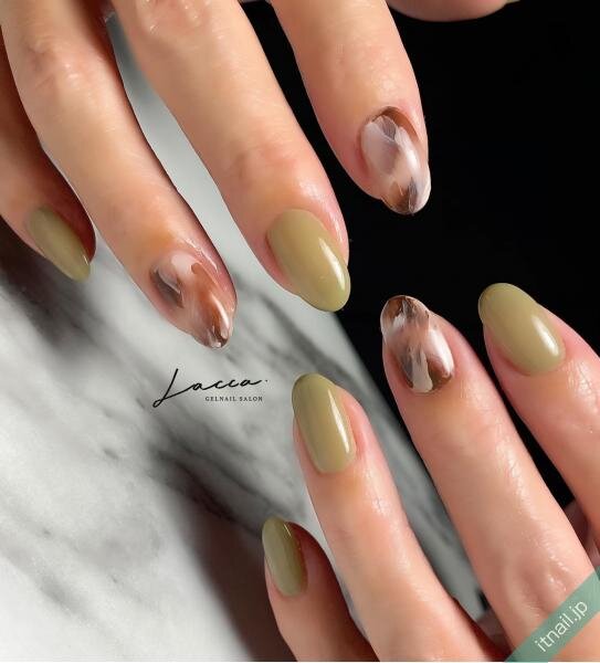 ブラウンネイルは、指先をきゅっと引き締めてくれるデザインなので、強めの印象になりすぎないようにもやもやしたネイルで抜け感をプラス!リラックスグリーンの柔らかい印象にも馴染みやすくなるので、初めての方にもおすすめ♪