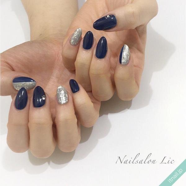 例えば、爪の左半分をネイビーで、右半分をシルバーでカラーリングするデザインはいかがでしょうか。ネイビーの配分を少なくしてキラキラのデザインに仕上げたり、逆にシルバーの配分を少なくしてシックで上品なデザインに仕上げたりというデザインもいいですね。