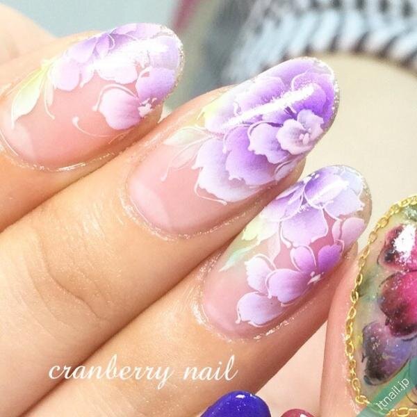 パープルの花を爪の先端から描きます。深めに描いて、花の存在感を出しましょう。緻密に描かれた手描きのフラワーフレンチが大変美しく、芸術的ですね。