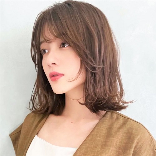 同じ前髪なしでレイヤーカットを使った鎖骨くらいのボブでも、レイヤーを入れた髪の毛が顔にかかるようにすると、小顔効果がぐっとアップしますよ。
