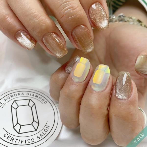 マットな質感のオーロラ宝石デザインがとってもカッコ良いネイルです。ブラウンのマグネットネイルとの相性もバッチリで、指先をうる艶にみせてくれます。まるでアクセサリーを身につけているかのような宝石ネイルですね!