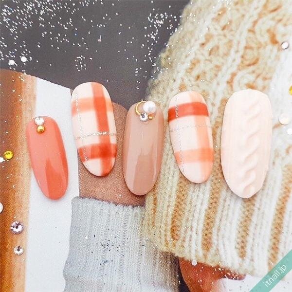 アイボリーのニットネイルと、オレンジ系のチェック柄で、指先から冬を満喫♪オレンジによって温かみのあるネイルに仕上がっていますね。キラキラしたラインもアクセントになっていておしゃれです。