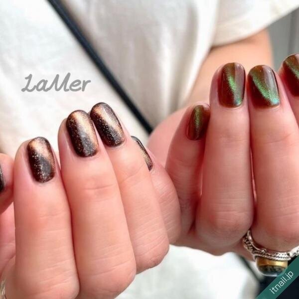 深み発色を楽しみつつ、女性らしいあたたかみも意識したいときには、ダークブラウンがぴったり。かっこよさと上品さが共存するハイセンスなネイルにまとまります。マグネットの繊細かつ大胆なきらめきとも相性ぴったりですよ。