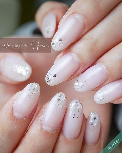 凹凸がなく、フラットなフォルムがお好きな方にオススメのデザイン。グリッターであれば、凹凸がほとんどなくともキラキラにできます。ホワイトグラデーションの可憐なイメージに合わせて、量は控えめにするのが◎。指先だけに、ちょこんと乗せてみて。