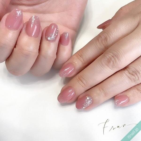 肌にフィットするモーヴピンクのワンカラーに、シルバーのラメや結晶を添えて、ちょっと華やかに。ラメ感はありますが、キラキラしすぎずボリュームがちょうど良いですよね!結晶は、単体ではなくラメとミックスしながらアートをしているのでさりげないところも素敵◎。大人っぽいけど、可愛らしさのあるデザインがお好きな方は是非トライしてみてくださいね。