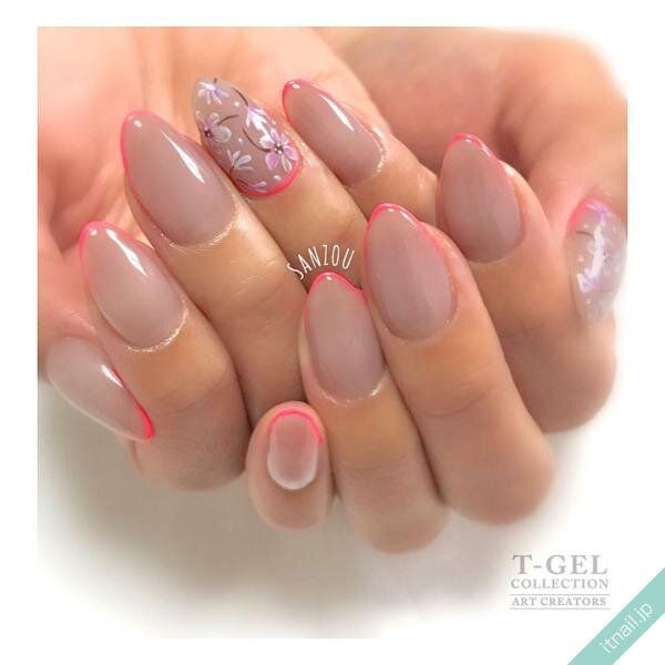 繊細なフラワーアートが大人な印象のネイルデザインです。ベースが肌馴染みの良いピンクベージュなので、スキニーフレンチのネオンピンクが派手になりすぎていませんね!オフィスネイルにもおすすめです。