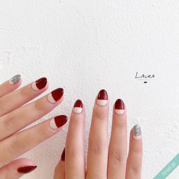 カッコいいイメージがお好きな方には、こちらのデザインがオススメです。ベースは、シルバーのフレンチと、ワンカラーをミックス。そこに、赤・白のハーフムーンアートをON。左右で違うカラーにして、ちぐはぐにしているところもセンスが光ってオシャレ。大きめのリングとも、相性バッチリ。普段ゴールドのアクセサリーが多い方は、シルバーのミラーパウダーをゴールドにチェンジするのもアリです。
