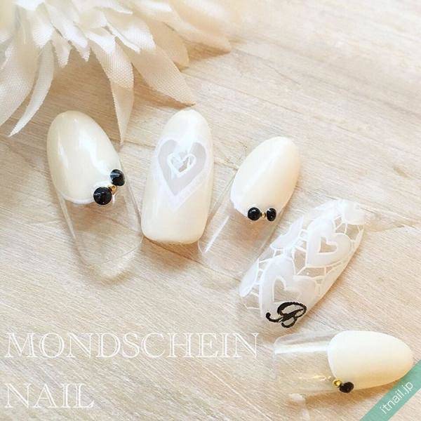 例えば、ベースを透明度の高い色味でカラーリングして、ホワイトジェルでコットンレース風のハートモチーフを描いたデザインはいかがでしょうか。