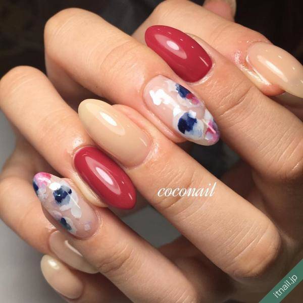 スキンカラーをベースとしたデザインにルビーとネイビーが差し色になって、大人の魅力あふれる素敵なネイルに仕上がります。