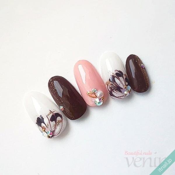 人差し指と小指はシックなブラウンのワンカラ―で揃えましょう。中指は、あえてピンクのワンカラ―×ストーンデザインにして、可愛らしさをプラスしてみてくださいね♡