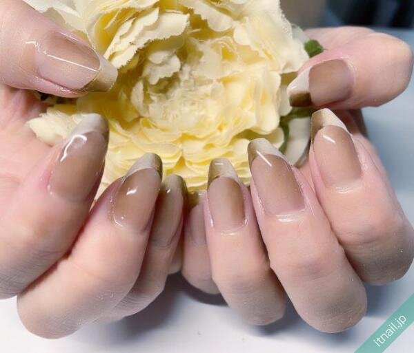 同系色の濃淡が可愛い、透明感を抑えたこっくりなオンブレフレンチ。ブラウン系は、誰でも似合う間違いないカラーのひとつですね。こっくりベージュのグラデーションでハッキリとした印象に。濃淡でゴールド感もあり、アクセサリーっぽい印象もあります。温かみがあるデザインなので、冬の時期のオンブレフレンチとしておすすめです。