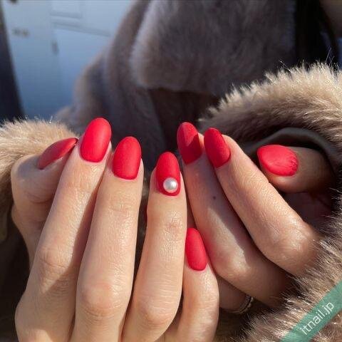 ちゅるんとした明るめのレッドがステキな、ワンカラーネイル。指によってパールの配置やサイズをチェンジして、ちぐはぐ感もとてもキュートです。ピンク×パールだと可愛くなりすぎるデザインでも、赤をチョイスすることで大人っぽくできます。真っ赤なベースカラーに、パールのホワイトが映えて一目置かれるハンドに♡