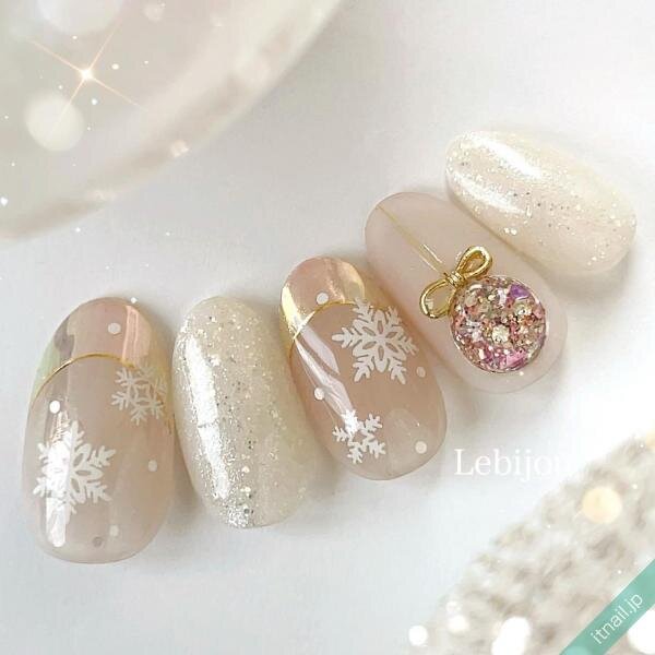 オーナメントに大きな雪の結晶をぽんっと入れたデザインは、シンプルですがアクセントになっていてとても可愛いですよね♪グレージュ系の落ち着いた色でまとめているので、大人可愛いネイルが楽しめます。