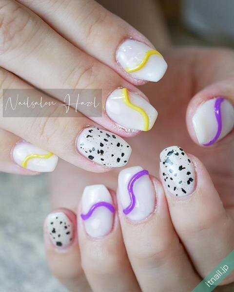 これも「うねうねネイル」の一種です。このデザインには、ネオンカラーやビビッドカラーを使うことが多いです。合わせているアートは「うずらネイル」と言います。人気のアートなので最近よく見かけますね。