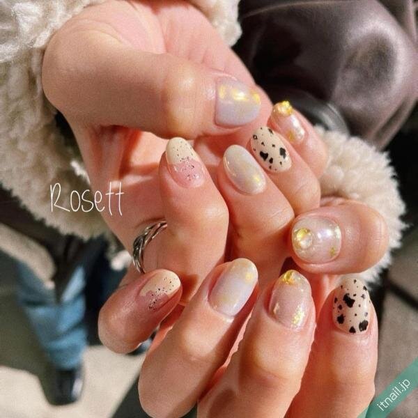 すべての爪にダルメシアン柄を入れて、可愛いネイルを楽しむのもおすすめです。春はベースの乳白色をシアーなものにして、軽やかさを意識するのがポイント!どんなコーデにも合わせやすくなります。