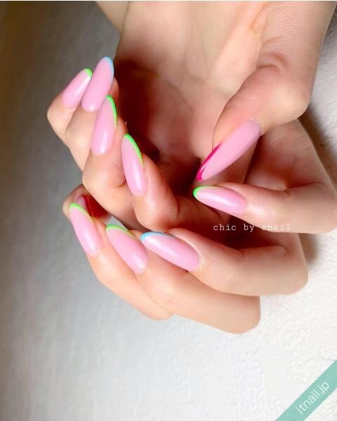 大人でも「カラフルなフレンチネイルにチャレンジしたい」という方なら、スキニーフレンチがおすすめ!できるだけ細く入れることがポイント♪蛍光色でもすっきり見えますし、遊び心のある色使いがこなれ感を演出してくれます。