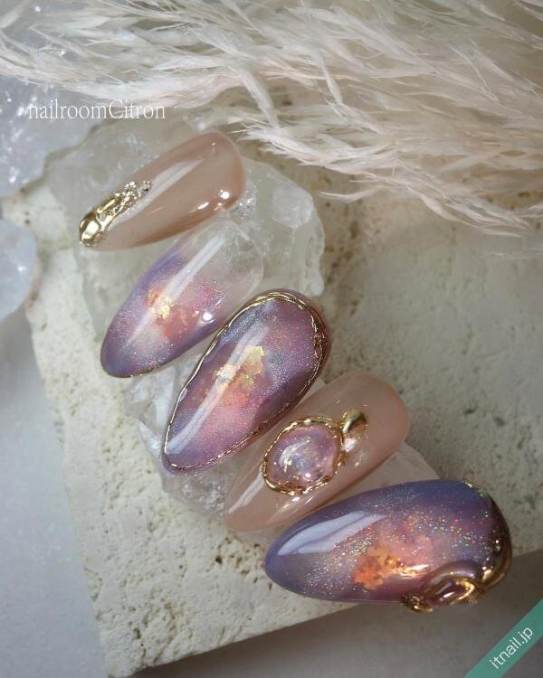 いろんなパープルを重ねて作るニュアンスネイルは、絵画の様な綺麗なグラデーションが魅力的。パープルに暖かみをもたらすゴールドのメタリックネイルが、指先に輝きを呼び込みます。色調を合わせることによって、上品なパープルのニュアンスネイルの完成です。