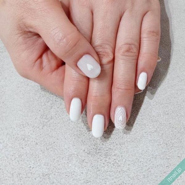 パキっと映えるホワイトは大人可愛く、赤く小さなハートが色っぽいアクセントに。1本ずつの控えめなハートがお洒落に見えますね。ワンカラーだと物足りないという方は、ハートをプラスするだけで印象が変わりますよ!