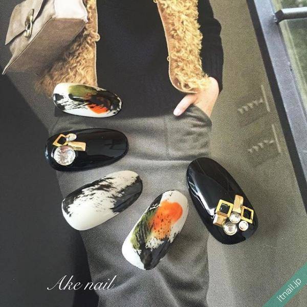 ライトオレンジ×カーキでアートするネイルとしては、アシンメトリーデザインもおすすめです。
