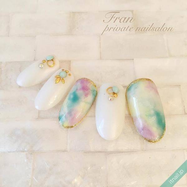 例えば、ベースカラーをクリアホワイトにして、ライトパープルとミントでタイダイ柄を描くデザインはいかがでしょうか。ブラウンやゴールドラメを差し色として使い、天然石風の仕上がりにするのも素敵ですね!