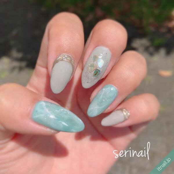 初夏は、ソルベカラーのブルーでひんやりしたネイルにシフト♡少しグレーを混ぜたようなソルベブルーにすると、大人っぽさが増して見えますよ!天然石風のデザインやシェルをのせて、キレイめネイルにするのが人気です。