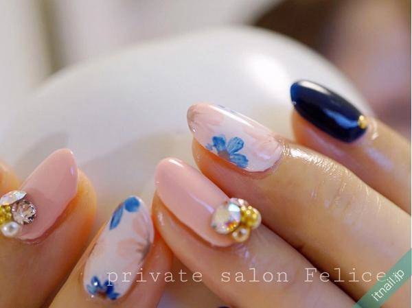 また、ネイビーをベースにライトピンクでフラワー柄を描くデザインも素敵ですね。ホワイトではなくあえてライトピンクでアートすることで、全体の雰囲気が柔らかくなります。