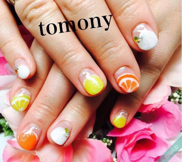 例えば、クリアジェルにキラキラのグリッターをMIXしたものをベースに使い、爪先に鮮やかなビタミンカラーでフルーツの輪切り模様を描くデザインはいかがでしょうか。