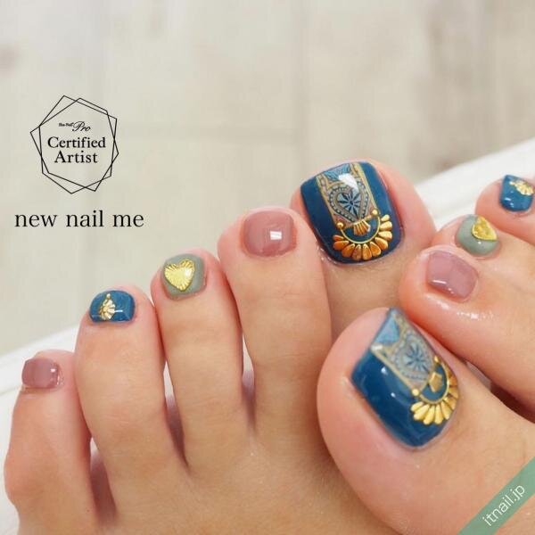 落ち着いた大人っぽいエスニック柄のフットネイルにしたいときは、くすみカラーをメインにしてみましょう!くすみピンクやくすみグリーン、くすみブルーとカラフルな色使いですが、くすみ感によって派手にならずにまとまっています。ゴールドのエスニック柄がまた上品さをプラスしてくれて、夏のデートにもぴったりな仕上がりになっています。
