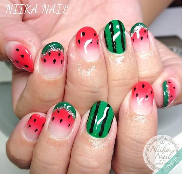 まるで色鉛筆で描いたようなアートが印象的ですね!ほかの爪は、レッドのワンカラ―と、グリーン×ブラックの縞模様のスイカの皮アートにしましょう。全体的にスイカのイメージになるように仕上げます。