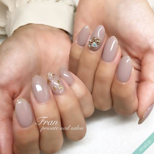 ラメの上にラインストーンを置くと、きらめきが倍増してとっても素敵です。くすみカラーのおかげで、あくまで上品にきまるのも嬉しいポイント。