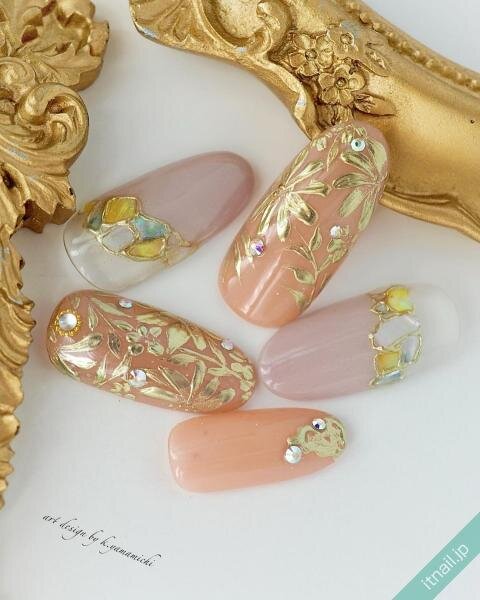 ゴールドミラーで爪全体にボタニカルフラワーを描いたら、ところどころにストーンを重ねてみて!キラキラがプラスされて、より華やかな仕上がりになります♡夏はシェルも入れて、爽やかでプリンセス感のあるネイルを楽しむのもおすすめです。