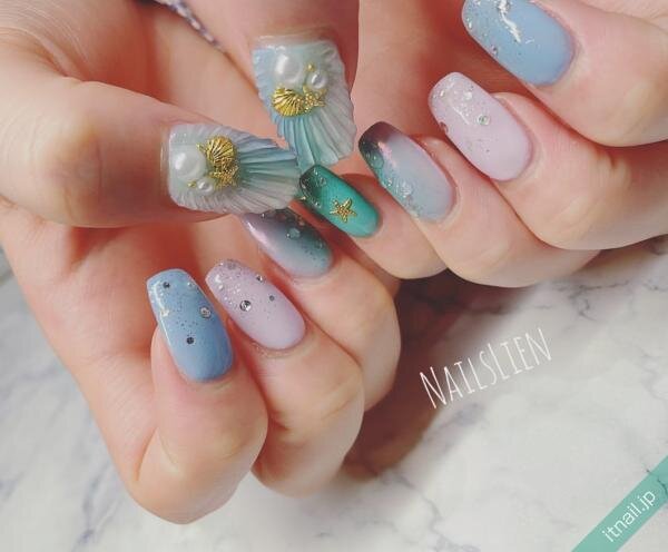 指全体を使って楽しい夏の海を表現して♪ジェルでぷっくり描いたシェルや、水しぶきのような水滴。ゴールドのパーツの貝まで!見ているだけでウキウキしちゃう、そんなネイルです。ブルーを筆頭にパープル~グリーンと続く美しいグラデーションが印象的です。