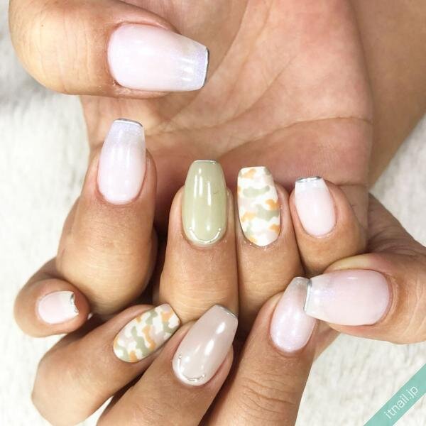 こちらは、フレンチネイルの先端部分にカモフラージュ柄を使ったデザイン。カーキだけでなく、ピンクを織り交ぜた柄になっているのがキュートですね。アート部分以外はストーンなどもなくシンプルで、日常のシーンにも取り入れやすいですよ。あえてショートネイルに組み合わせているのが、ナチュラルに見えるポイントです。