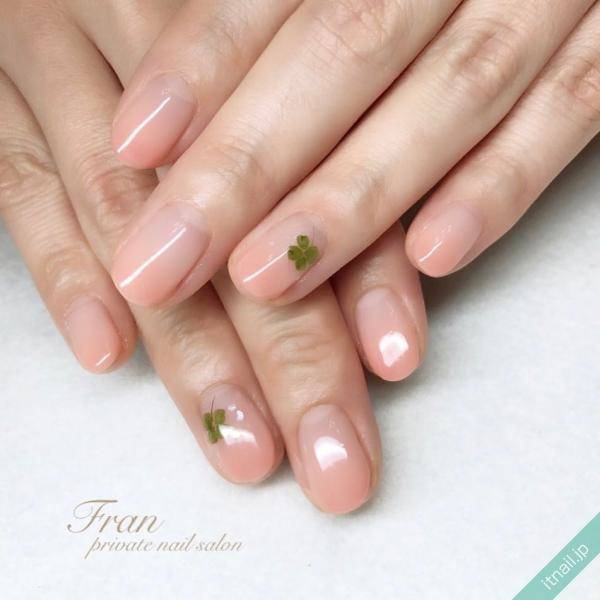 最近は、四葉のクローバーの形をしたドライリーフも販売されていますので、これを埋め込むのも素敵ですね。やや主張の強いカラーであるグリーンも、クリアカラーにしたりアートする範囲を狭くしたりすると、派手になることなく上品な仕上がりを楽しめるかと思います。