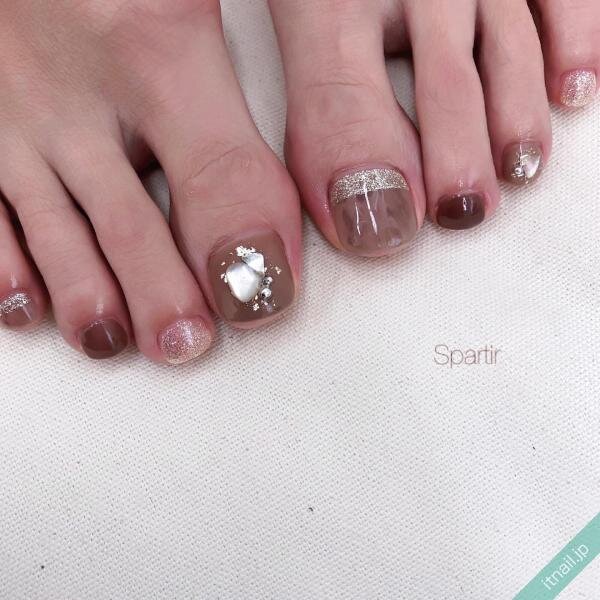 ガラスの破片のような輝きを放つシルバーの中に、ブラウンも少し入れながらキラキラしたフットネイルを楽しむのもおすすめです。スパンコールのような輝きが目を惹きますね。歩くたびにキラキラするので、足元が目立ちます。