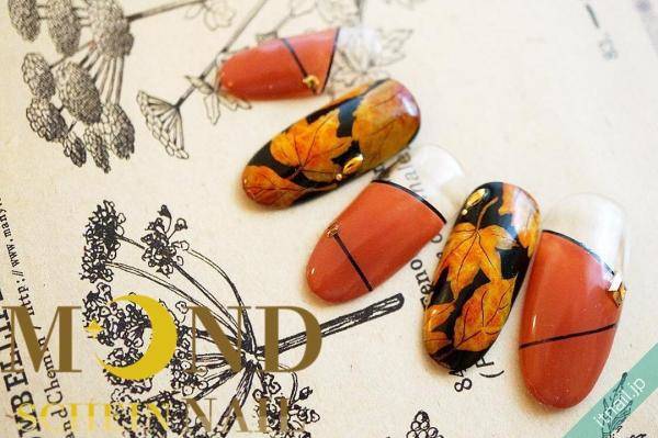 秋らしいカラーで楽しむのももちろん素敵ですが、秋らしい紅葉のデザインも素敵ですよ。あまりメジャーではありませんが、甘すぎないひねりのあるデザインが大人の女性にぴったりではないでしょうか?