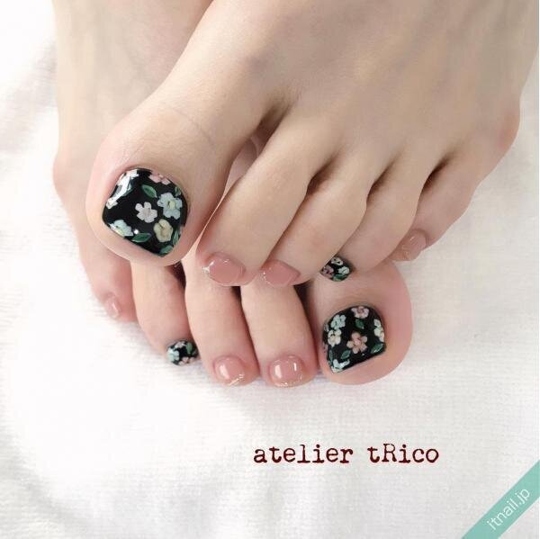 黒をベースに、水色やピンクなど淡いカラーのお花を咲かせ、フェミニンな柄ネイルを作っていきます。大人っぽくなじみのいいピンクベージュを合わせると、落ち着いた印象にまとまりますよ。お揃いの柄のワンピースと合わせるのも楽しそう。