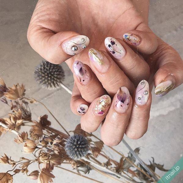 ともすればポップでキュートなイメージばかりが先行しやすい押し花ネイルでも、ポプリみたいな枯れ色を意識した配色にしてあげるだけで、大人っぽさをネイルで表現したい人にも親しんでもらえるデザインになります。この秋冬に是非ともチャレンジしてみてください!