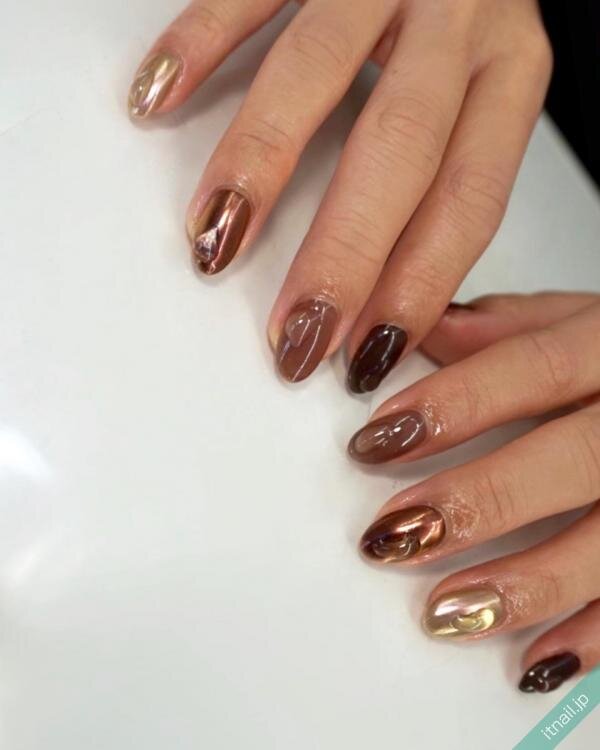大人なニュアンスデザインをアシンメトリーネイルで。ブロンズミラーの上品な光沢感が角度で光りシックな雰囲気。ブロンズの深みがネイルに馴染むので悪目立ちしません。もう片方はニュアンスで抜け感を作ってバランス良く馴染ませるのがおすすめ。