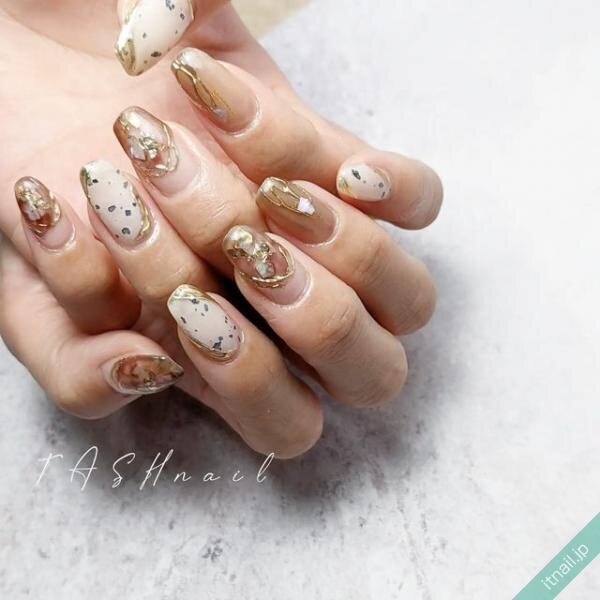 ぶち模様とヌーディカラーでシンプルにまとめたデザインです。ゴールドも爪全体ではなく、ぽつんと入れているので、さり気ない輝きを楽しませてくれます。ショートネイル派さんにもおすすめのネイルです。