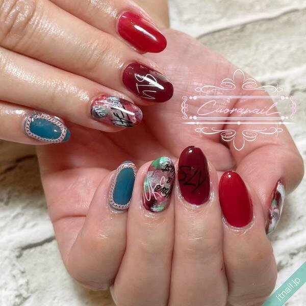 こちらは、ボルドーとターコイズブルーを組み合わせた現代的なデザイン。左右1本ずつ、さまざまなカラーを織り交ぜたニュアンスネイルを加えています。各爪に大胆に入れた手描き英字アートが、センスを感じさせますね。小指の爪をぐるっと囲んだ、チェーンモチーフも個性的です。